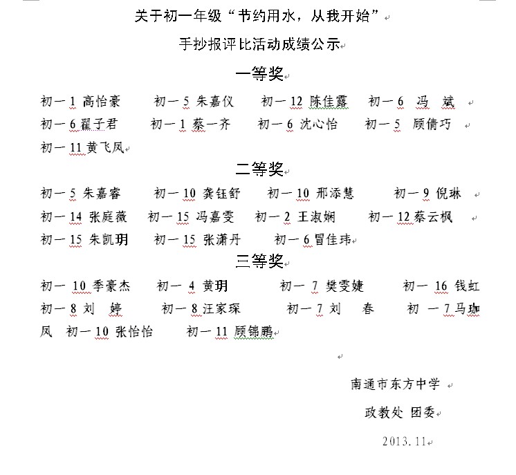 关于“节约用水 从我做起”手抄报评比成绩公示
