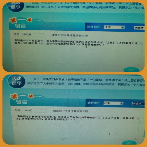 为进一步推动未成年人广泛开展学雷锋活动,根据南通市文明办、教育局联合下发的《关于组织开展“学习雷锋、做美德少年”网上签名寄语活动的通知》的精神,我校以“六一”国际儿童节为契机,利用课余活动时间,组织学生登陆中国文明网、央视网、南通文明网,参与了网上签名寄语活动,同学们积极踊跃参与,留言寄语文字质朴、感情真挚、令人鼓舞,句句留言表达了同学们对雷锋的敬仰和学习雷锋精神、争做美德少年的决心。