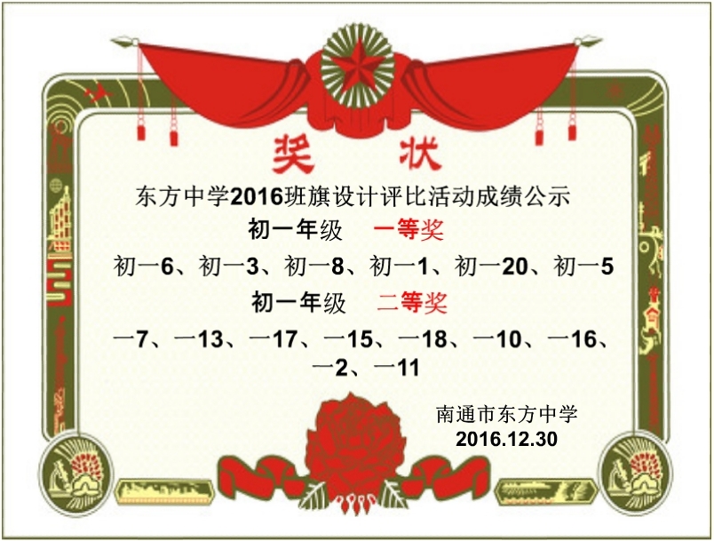 政教处、团委组织团委部分老师和美术教研组全体老师从对班旗从创意、美感、内容三方面进行评分,经过严格评选,初一(6)班等11个班获得班旗设计一等奖。初一7班等16个班获得二等奖。