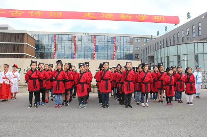 校门口,整齐的方阵气势恢宏,朗朗的吟诵萦绕耳旁。分别代表二年级、三年级、四年级的三个班,吟诵《三字经》、《弟子规》、古诗词等经典,向同学们和家长们展示着中华古典诗词的无穷魅力。