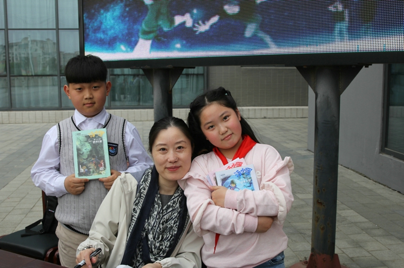 讲座结束后,谷老师热情地为同学们购买的书籍签名,和小读者们合影留念。