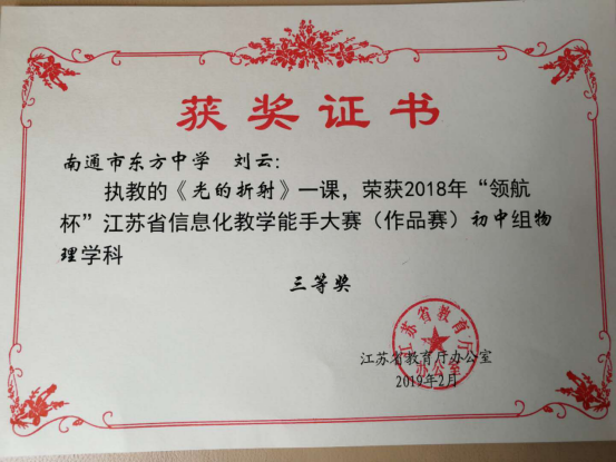 日前,“领航杯”2018年江苏省信息化教学能手比赛圆满结束,比赛结果随之揭晓。我校教师在省、市“领航杯”信息化教学能手大赛中喜获佳绩,刘云老师获省三等奖,刘云、施婷婷老师获南通市一等奖,朱琴老师获南通市二等奖。
