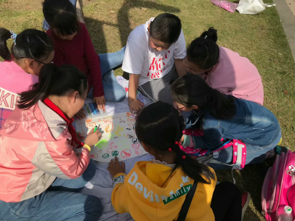 五六年级的小哥哥小姐姐,争当环保宣传形象大使。班级学生分小组,设计出符合学校生活的环保宣传标语,“手下留情 脚下留青”创意无限,让环保教育更加深入人心。