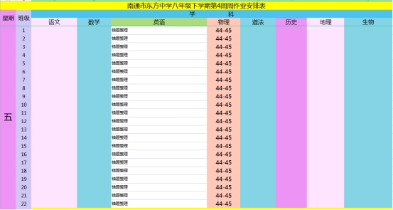 南通市东方中学2021~2022学年度第二学期第4周作业安排表