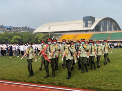 仪式伊始,国旗护卫队迈着铿锵的步伐护卫五星红旗来到旗杆下,在庄严的国歌声中,全体师生肃立唱国歌,升国旗。