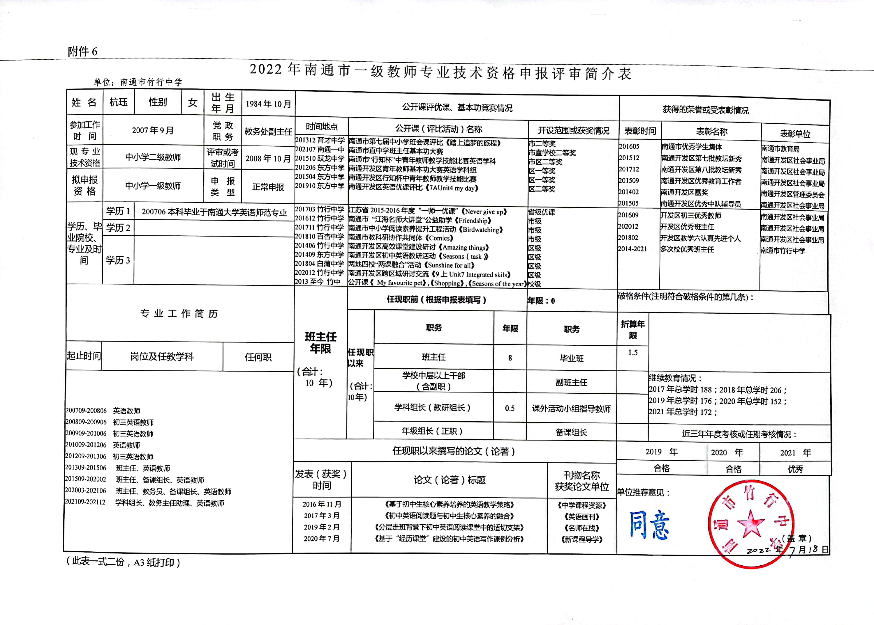 南通市竹行中学关于2022年职称申报推荐结果的公示