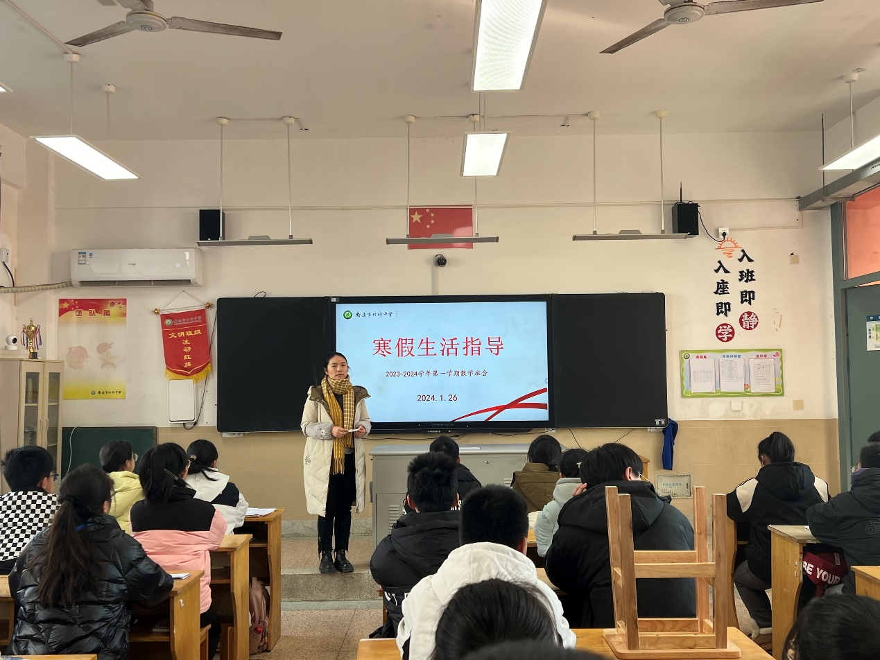 之后,各班主任开展了寒假生活指导主题班会,从消防安全、人身安全、交通安全、饮食安全、防踩踏教育、严防溺水、未成年人禁燃烟火等十个方面,列出如果遇到危险情况时的应对方法,同时对学生的假期学习计划及德育实践作业提出了相关要求和建议。