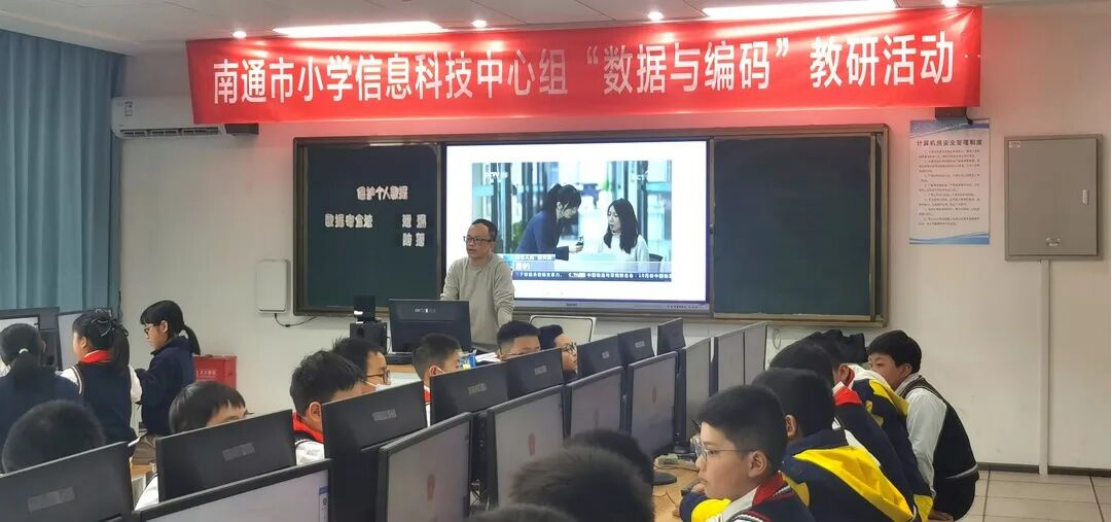 海门实验学校附属小学朱春健老师执教研讨课《保护个人数据》,朱老师以身边的真实情境让学生思考数据泄露的可能性,使学生认识到数据存在的潜在威胁,进而提高安全防范意识,朱老师带领学生从个人操作、技术原理、法律保障三个层面了解数据防护措施,同时认识自主可控技术对保障数据安全的重要意义。