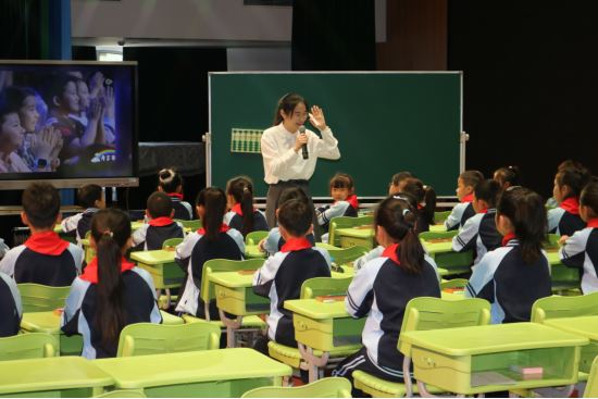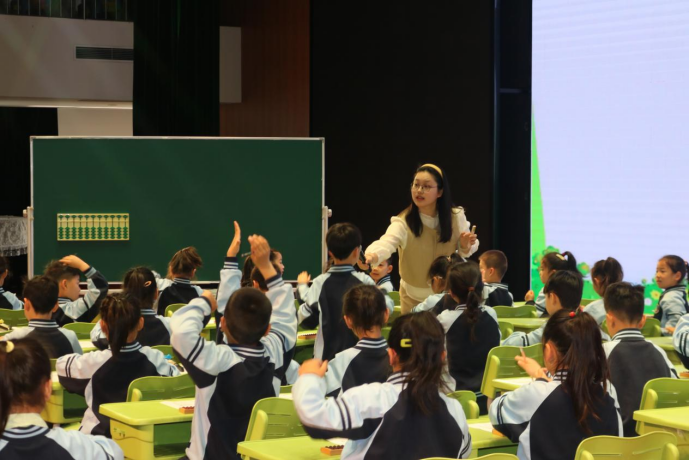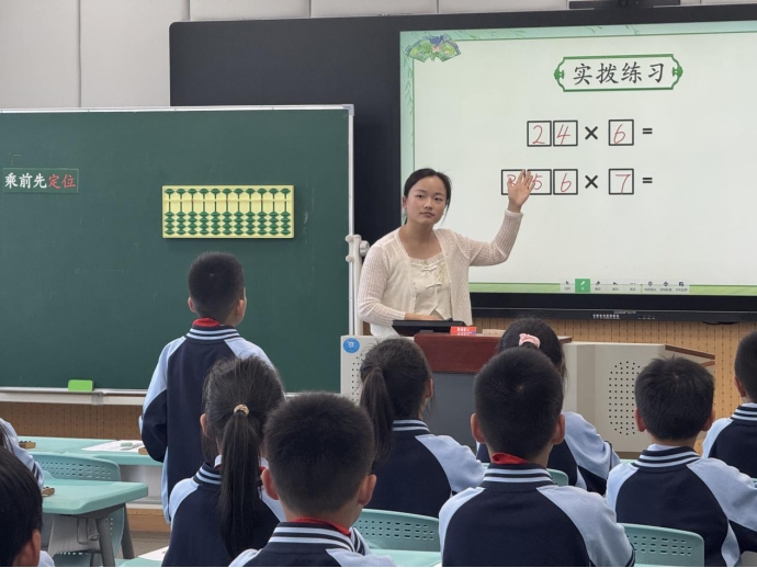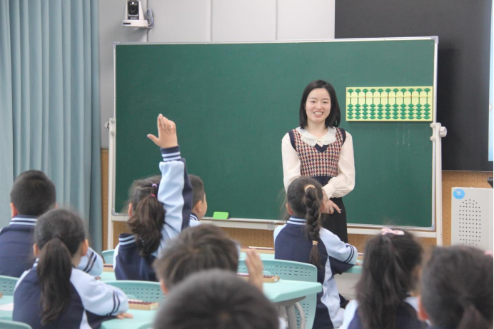 南通市郭里园小学吴晓萍老师执教《两位数乘整十数》。吴老师从《我多想去看看》课文引入创设情境,实现了与语文跨学科教学,引导学生完成珠心算的学习,从试拨到课件演示、同桌互拨、空拨校对,层层递进,助力学生内化珠算技能。