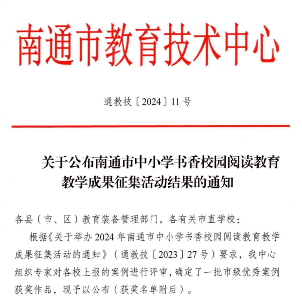 近日,由南通市教育技术中心主办的市中小学书香校园阅读教育教学成果征集活动评选结果揭晓,开发区多个优秀案例脱颖而出。