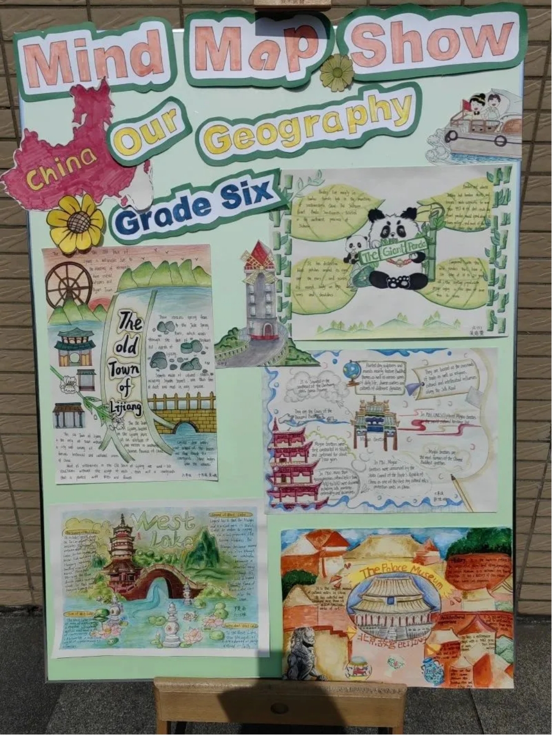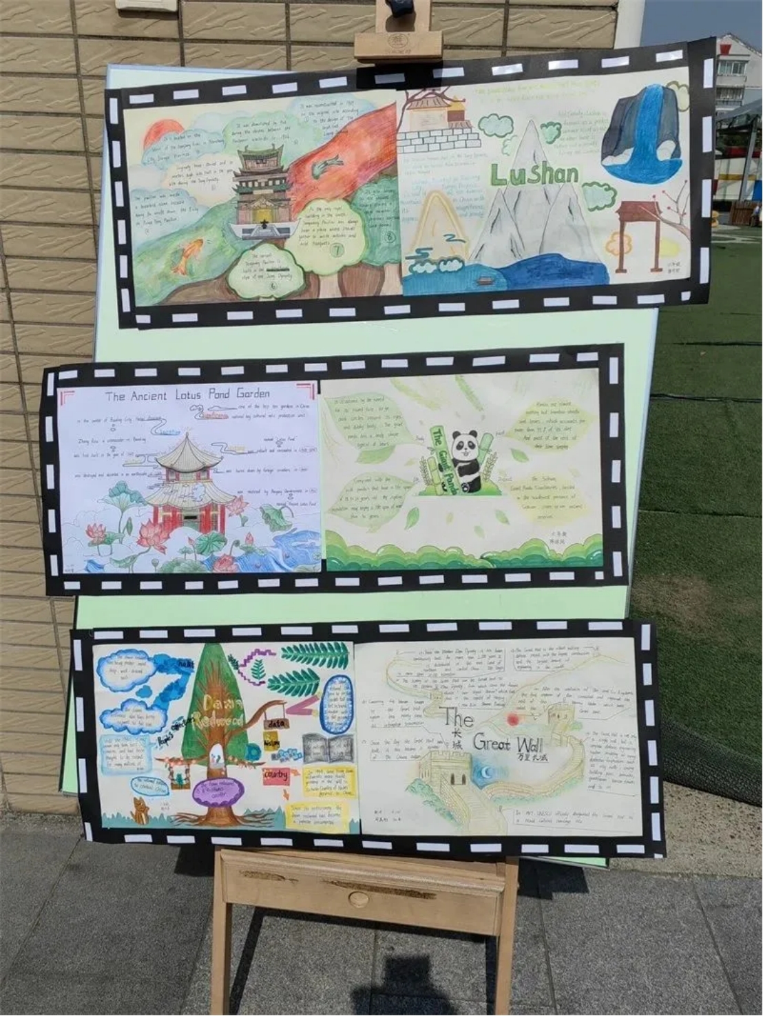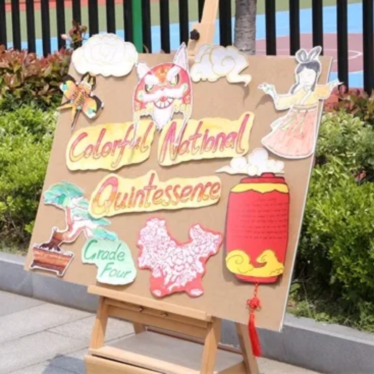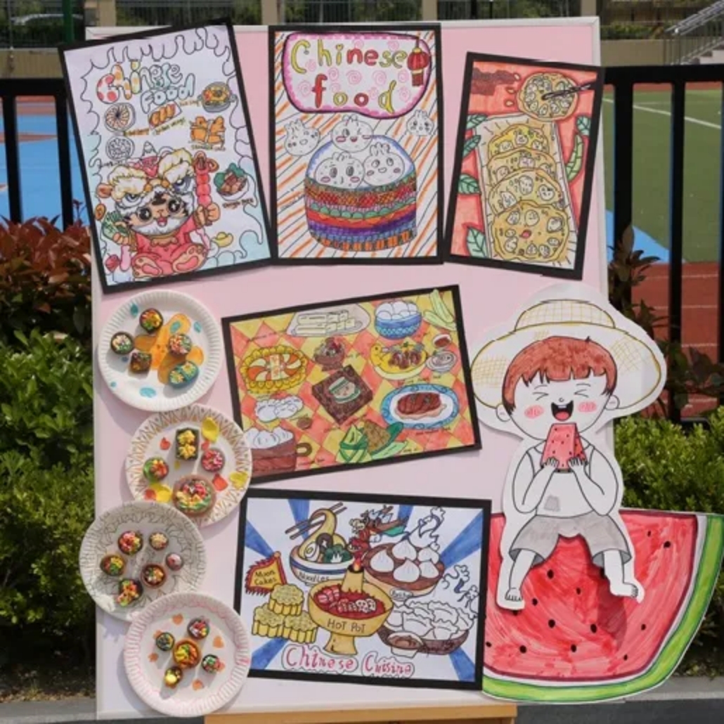 步入春光明媚的校园,首先映入眼帘的是实小龙娃们精心准布置的“中国传统文化展”。该展以“传统美食”、“缤纷国粹”、“二十四节气”及“祖国山河”四大主题呈现中国传统文化精髓。孩子们以图文并行的方式叙述,用雅韵绘画传承中式审美,用丰富英语讲述中国故事。