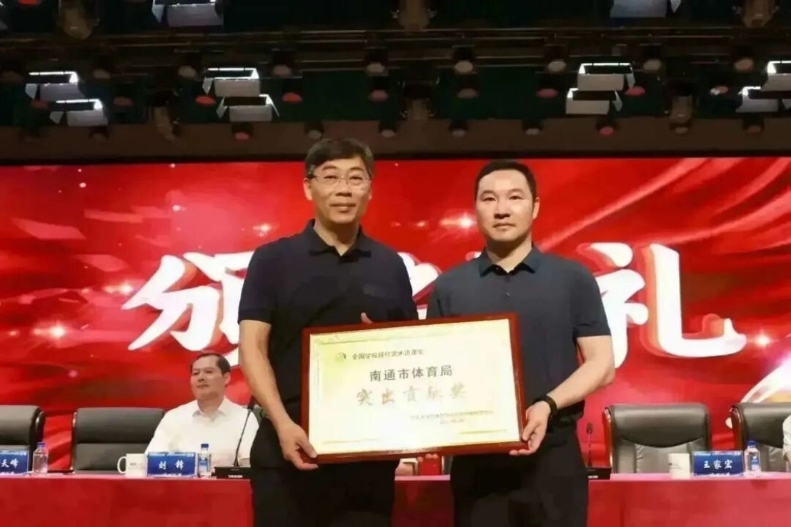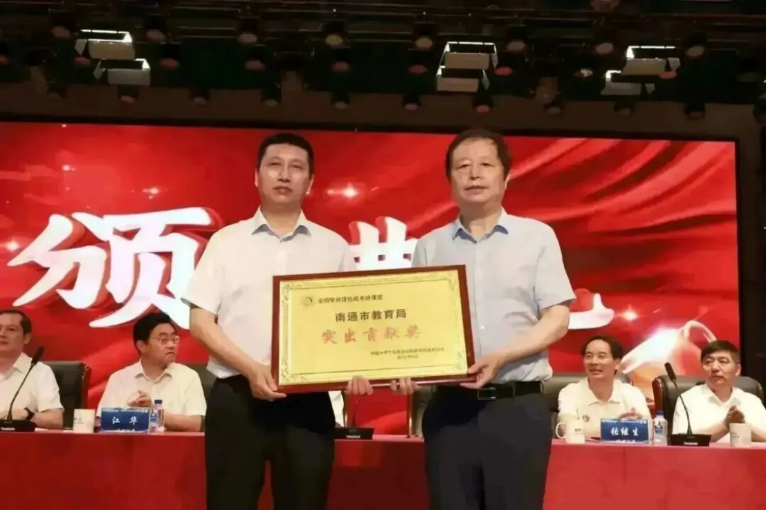 大会授予南通市教育局、南通市体育局、南通开发区社会事业局等3家单位全国学校段位武术进课堂突出贡献奖,授予复旦大学、浙江仙居中学、南通师范高等专科学校实验小学等51所大中小学为全国学校段位武术进课堂段位教学试验点学校。其中开发区的三家单位,我们实小集团的星湖校区、龙腾校区以及竹行小学获得试点学校授牌。