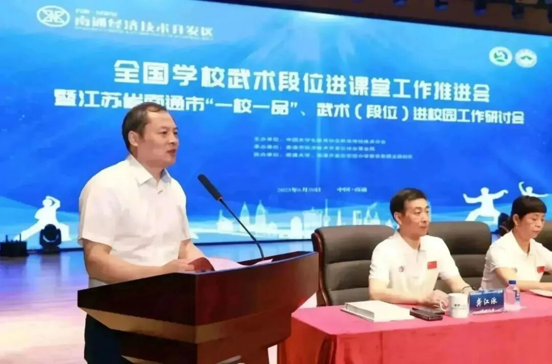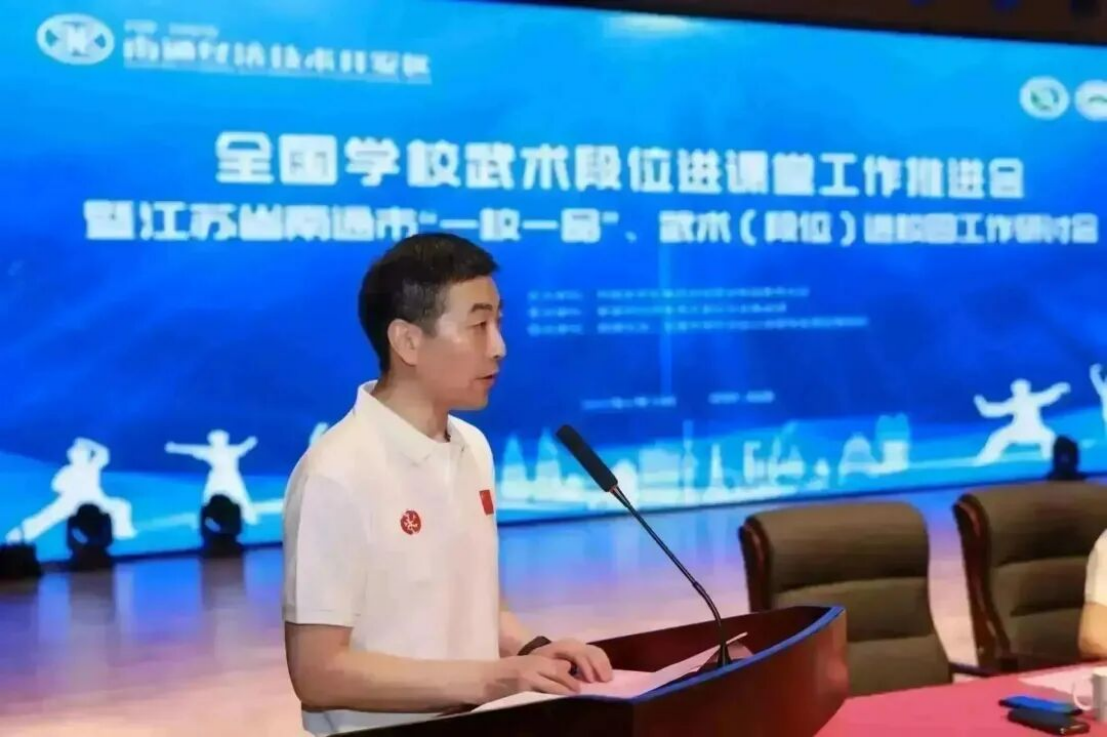 为深入学习贯彻党的二十大精神,深刻学习领会习近平总书记关于弘扬中华优秀传统文化的重要指示批示精神,加强武德教育,推进中华武术进校园、进课堂,6月20日,全国学校武术段位进课堂工作推进会暨江苏南通市“一校一品”、武术(段位)进校园工作研讨会在南通开发区实验小学教育集团龙腾校区顺利召开。本次会议由中国大学生体育协会民族传统体育分会主办,南通市经济技术开发区社会事业局承办。来自全国大近百名体育教育系统领导,中国大学生体育协会,民族传统体育峰会的各位专家参加了本次会议。本次会议由社会事业局副局长倪敏担任主持。