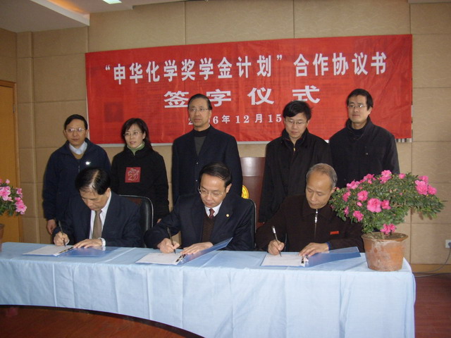 为鼓励学生勤奋学习,帮助学生顺利完成学业。由南通申华化学工业有限公司2004年出资在我校设立“申华化学奖学金”,奖额时间为两学年。两年来,申华公司领导对我校的飞速发展和该奖学金的良好绩效给予了充分肯定和由衷赞赏,故今年提出续签计划,于2006年12月15日在我校会议室举行“申华化学奖学金计划”合作协议续签仪式。申华公司董事长吴俊雄、申华公司总经理邵康乐、南通开发区党工委委员,组织部长王世瑞和我校曹钤校长等领导出席了该签字仪式,吴董事长、王部长和我校曹校长在协议书上签了字。 |